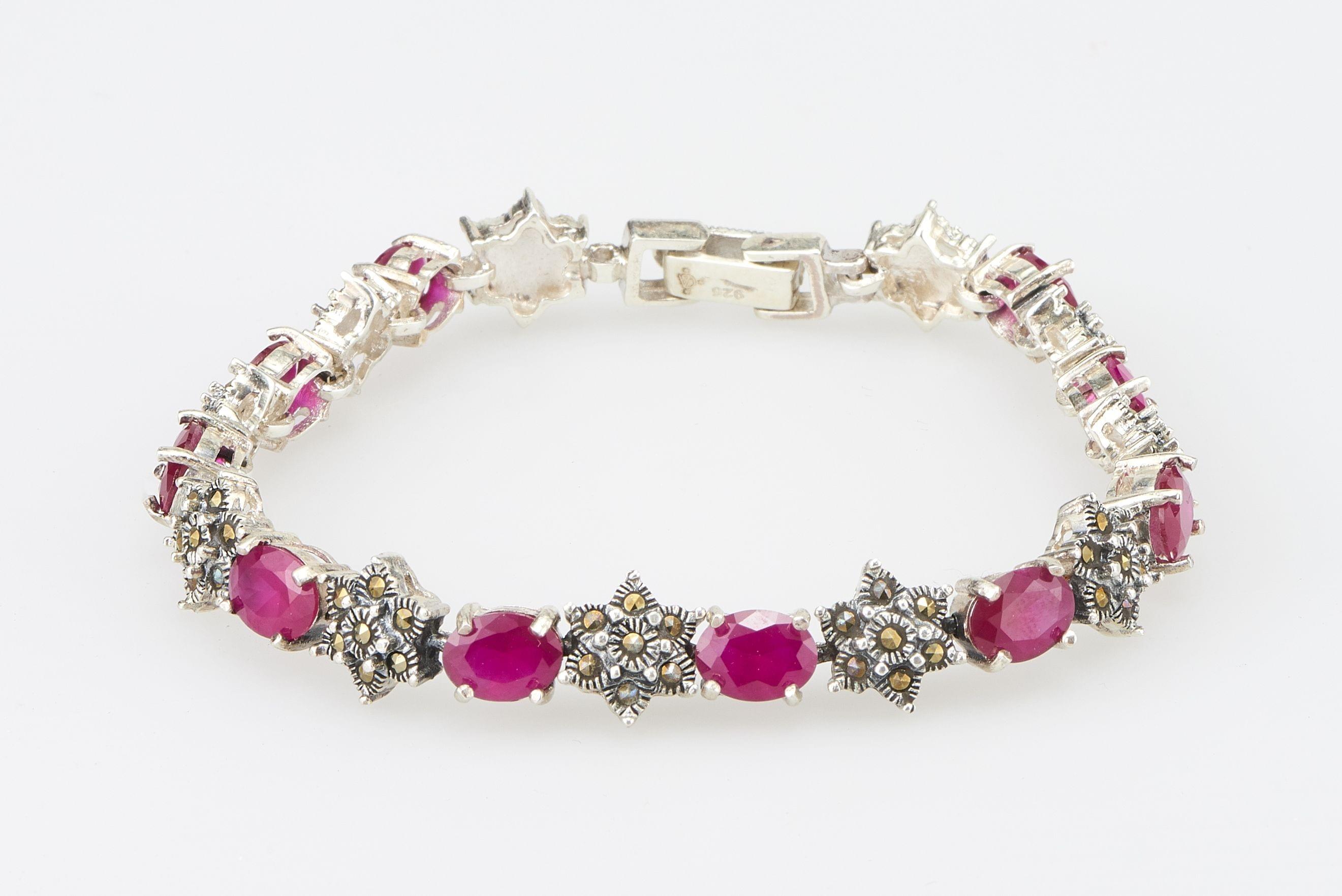 3234. *Bracelet ligne serti de rubis probablement synthétiques alternés de motifs de fleurs sertis de marcassites