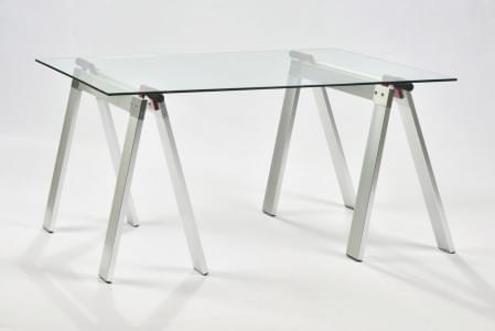 Table sur tréteaux tubulaires, aluminium et verre, 150 c 75 cm