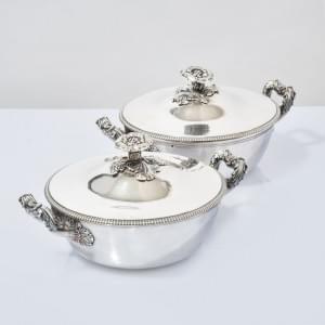 398. Paire de légumiers ronds à prise fleur et anse acanthes