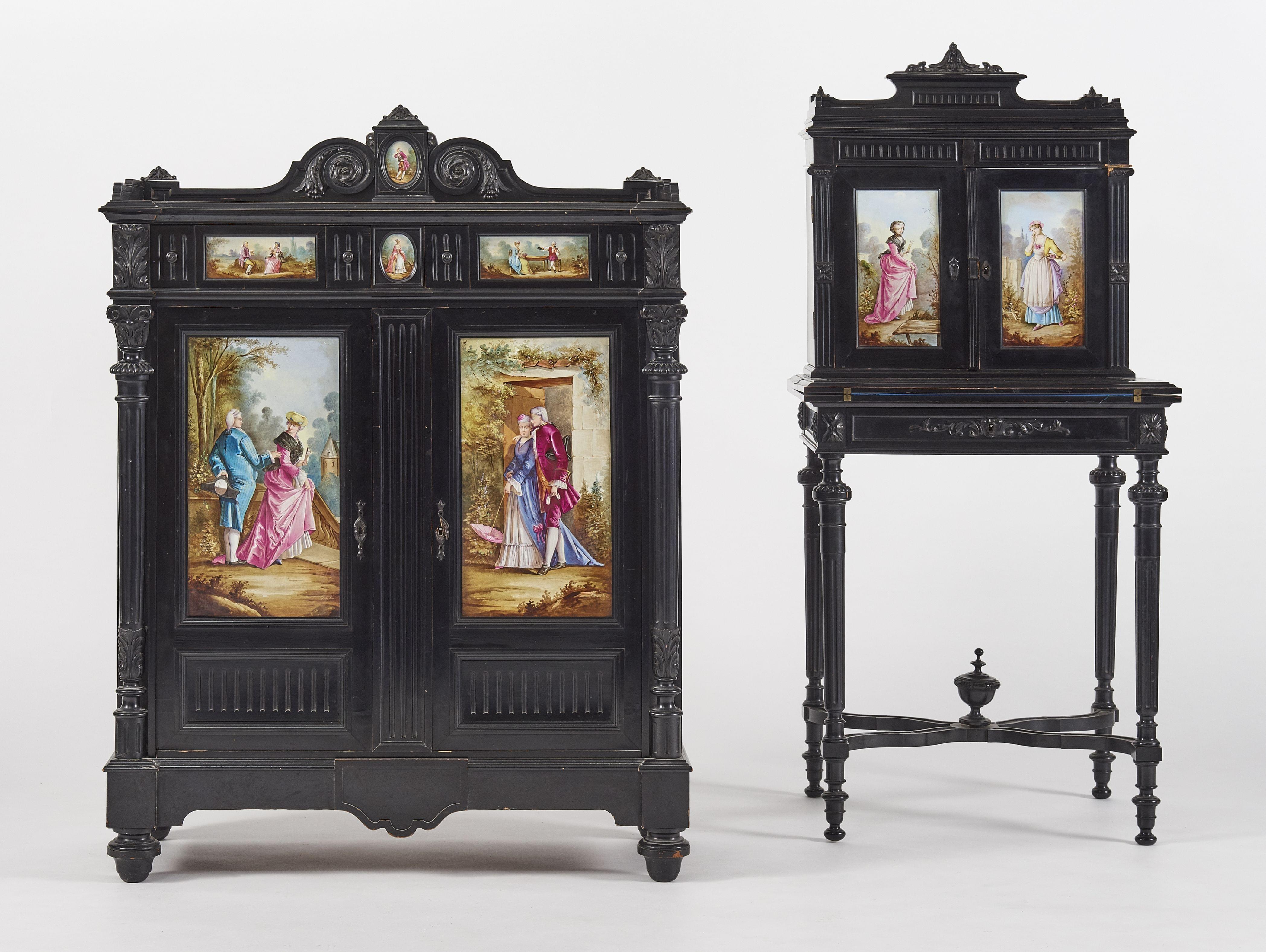 Bois noirci agrémenté de plaques de porcelaine à décor de scènes galantes, signées Quentin, 115x94x44 et 140x63x50 cm