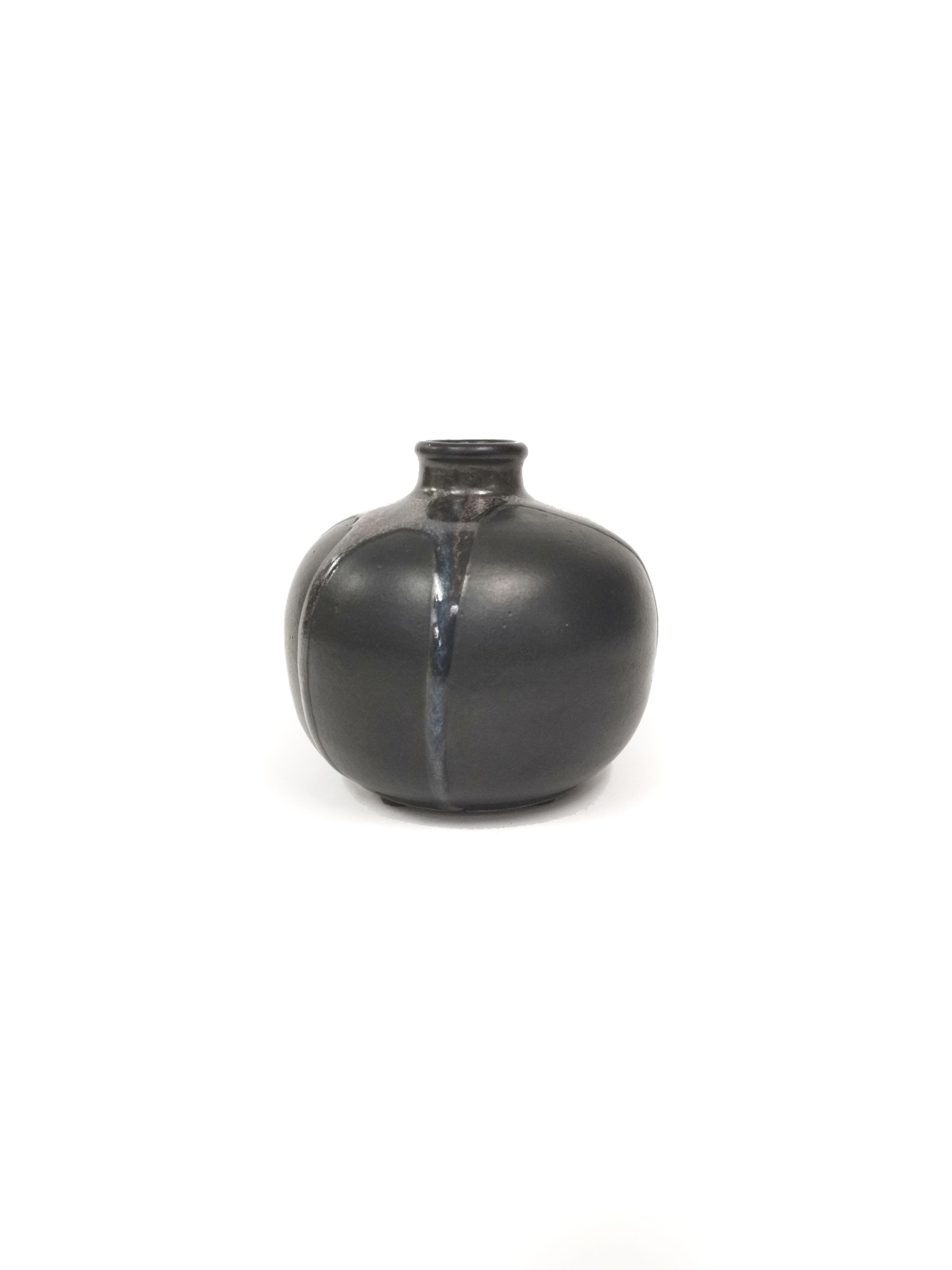 Vase boule soliflore, céramique émaillée noire à coulures bleutées, signé Bonifas et portant le numéro 28, D 11 cm