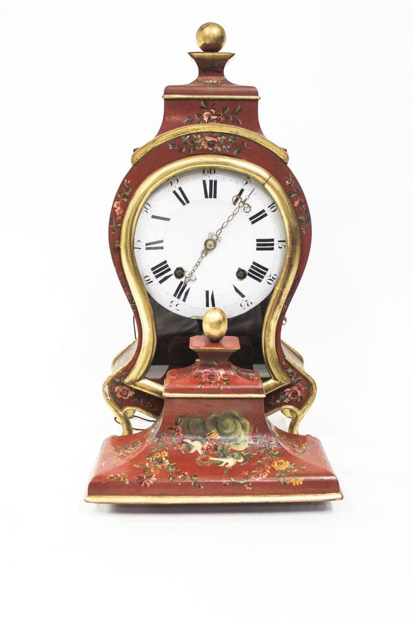 Bois laqué rouge et or à décor peint de fleurs, cadran en émail blanc, H 70 cm. Provenance : Château fribourgeois
