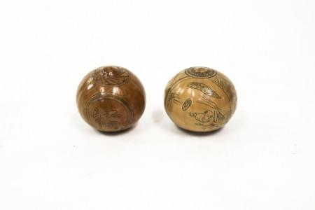 Noix sculptée et pierre, H 6,5 et 7 cm