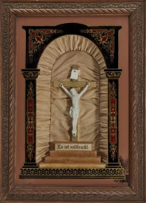Porcelaine, tissu, bois et fixé sous verre, 63x45 cm