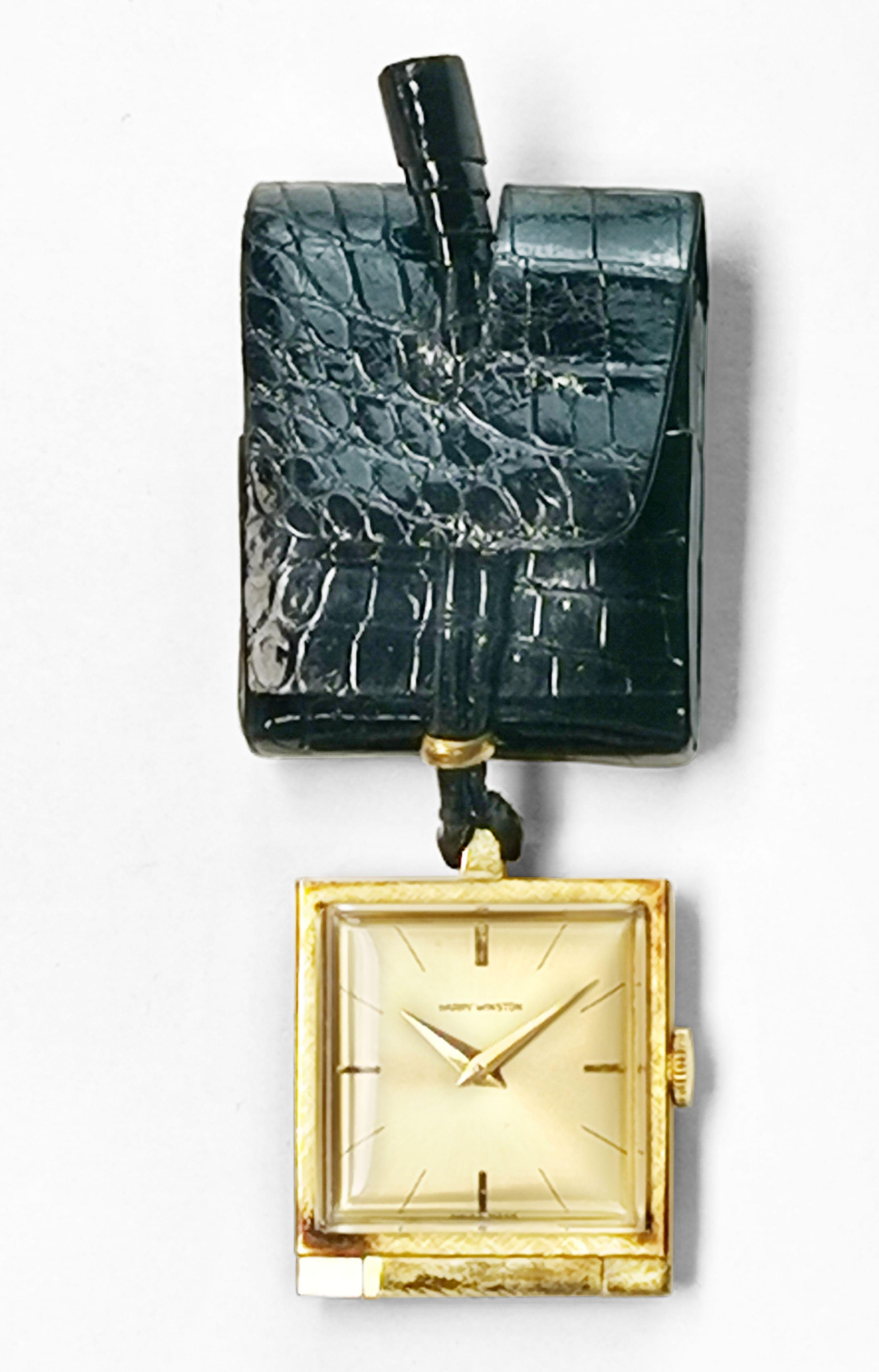 Cadran doré, aiguilles et index bâtons dorés, mécanisme apparant, or 750, 28x25 mm, poids brut 21 g, dans son écrin en cuir noir