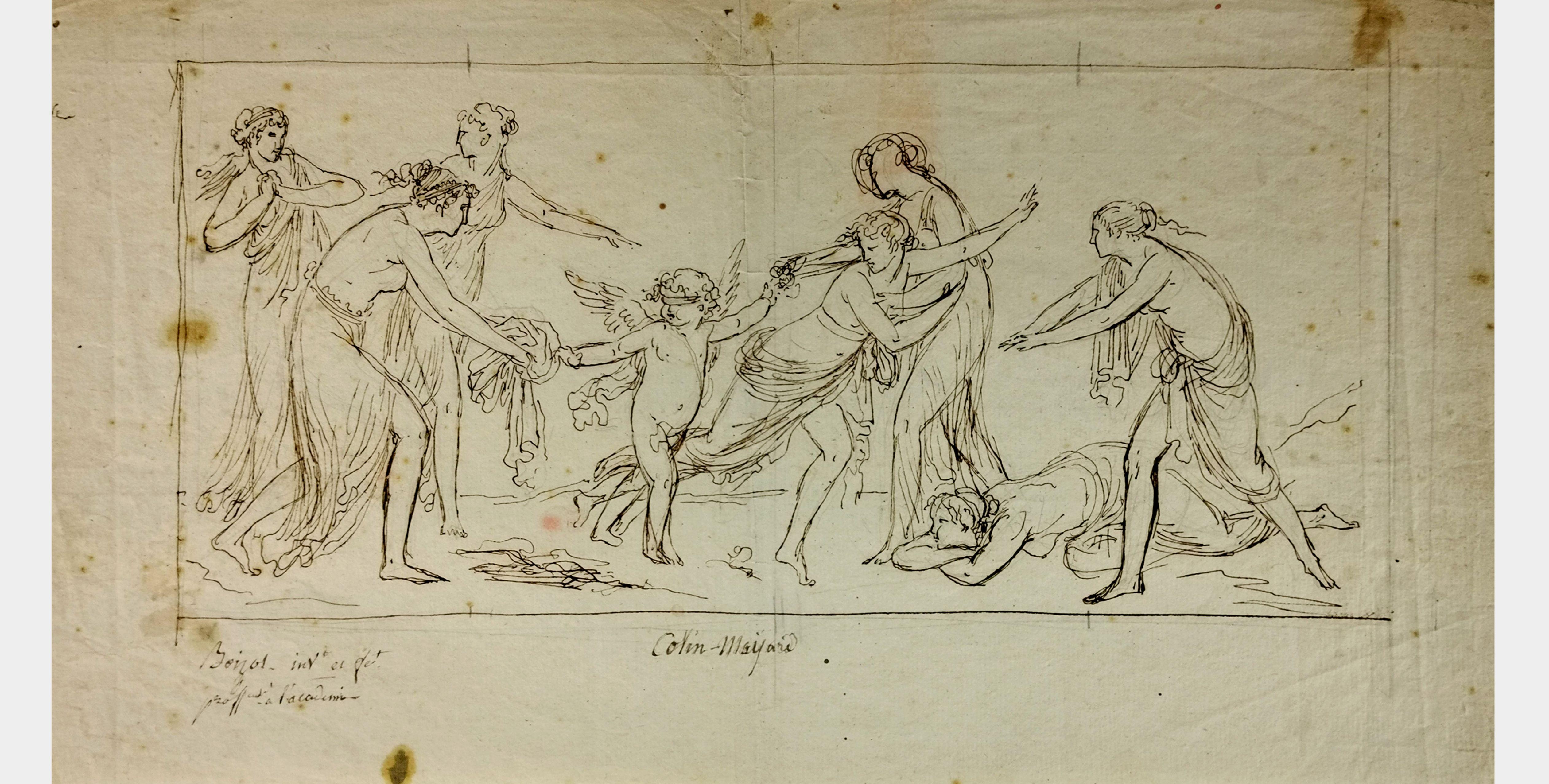 Etude pour l'amour aveugle, encre sur papier, signature apocryphe de Boizot, 19x33 xm