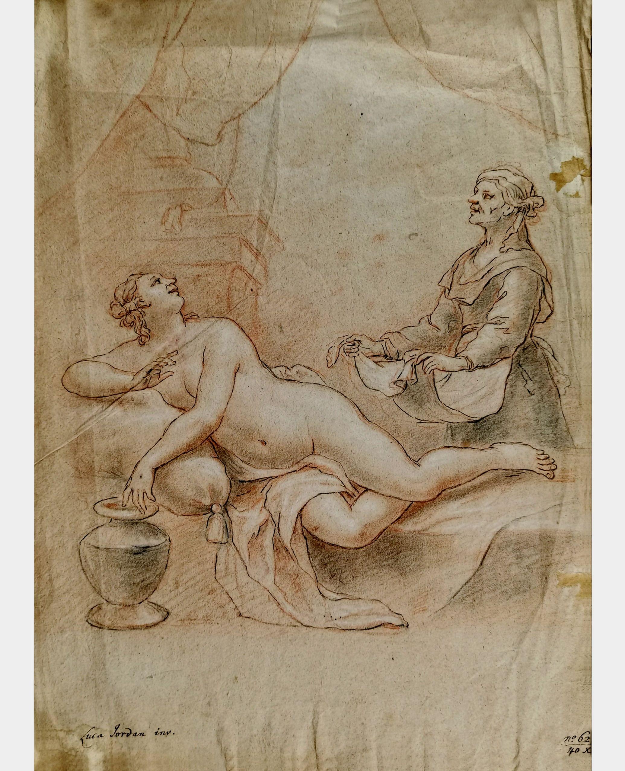 Danaé, fusain, craie blanche, sanguine et encre, au dos, études de personnages, 44x32 cm