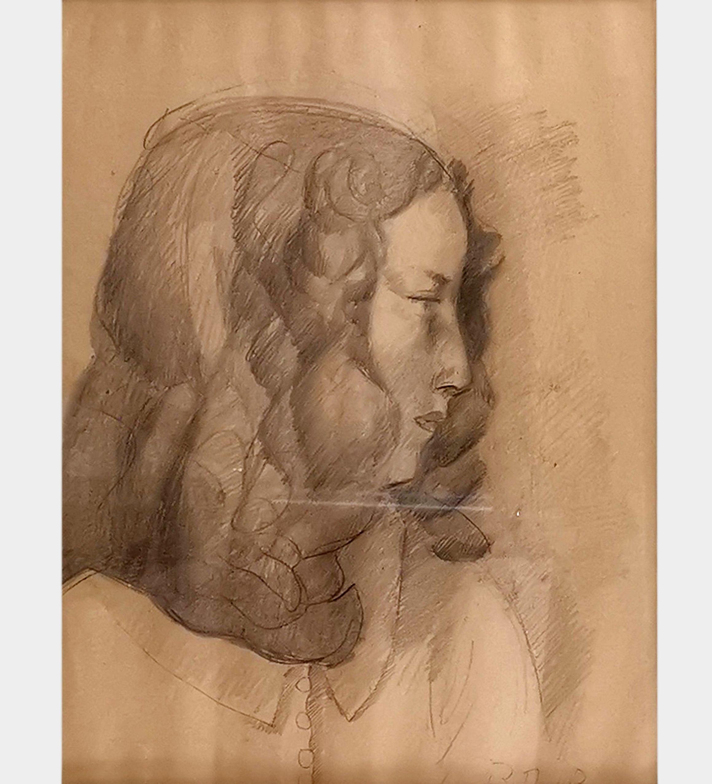 Femme aux fleurs, mine de plomb sur papier, monogrammée, 38x30 c...
