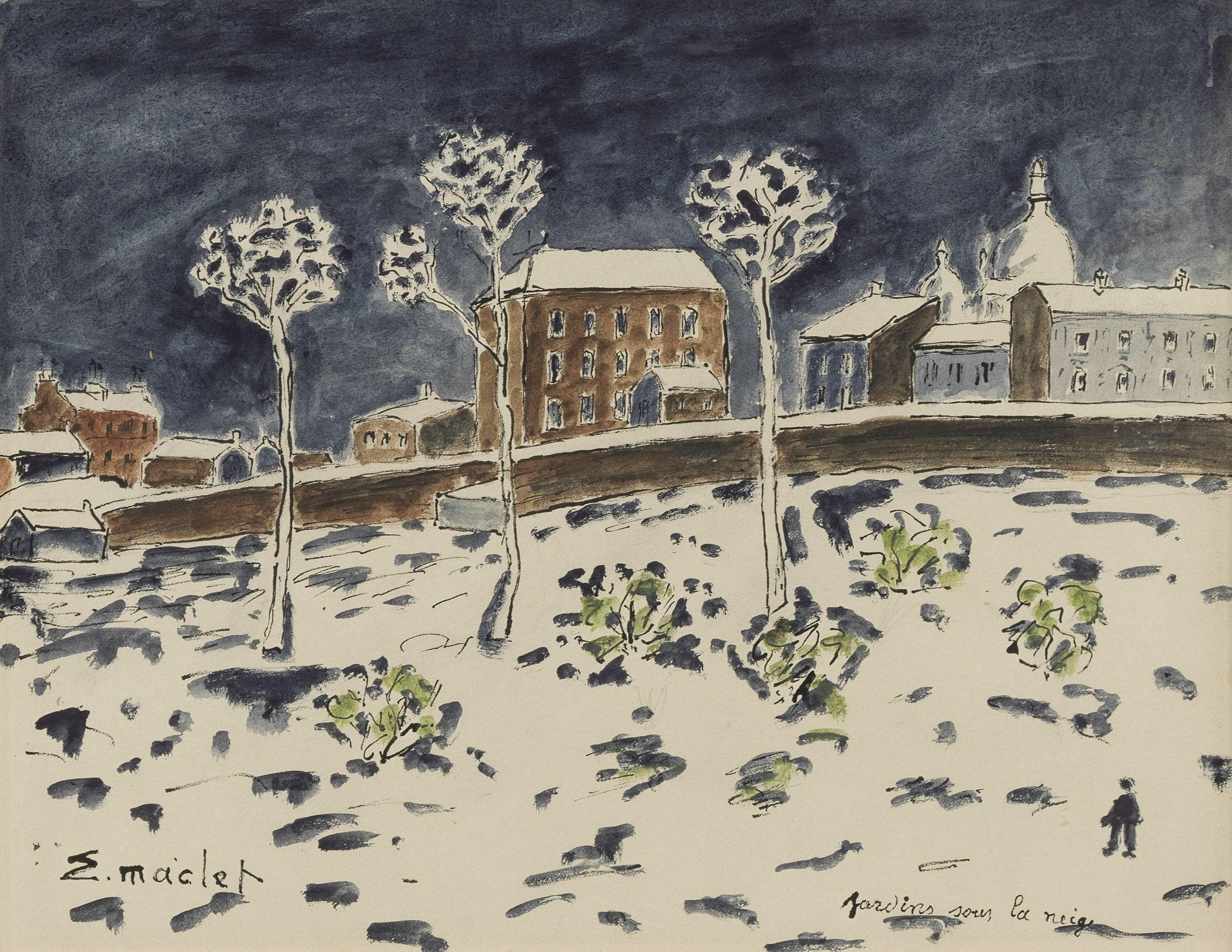 Jardins sous la neige, gouache sur papier, titrée et signée, 25x33 cm