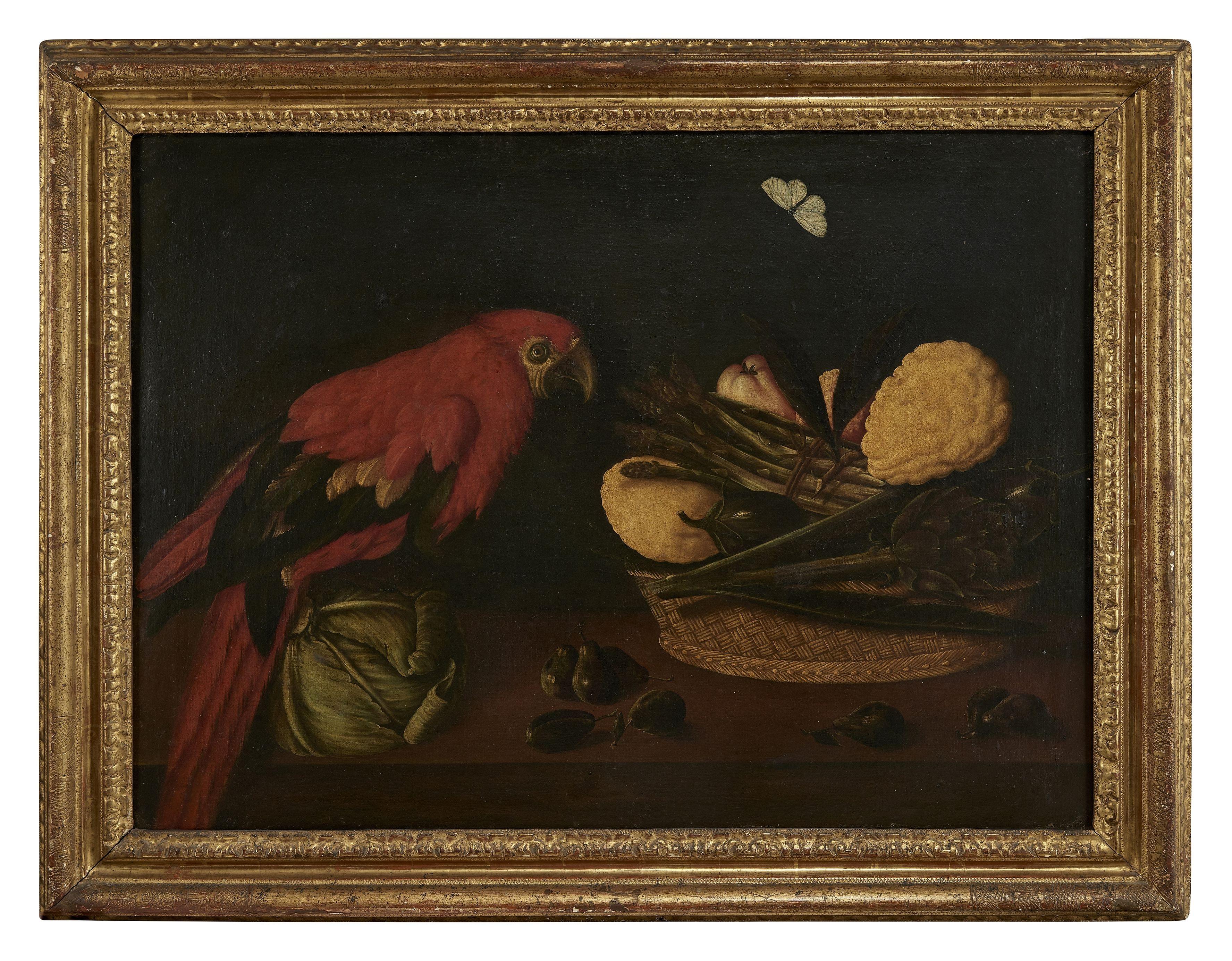 Nature morte au perroquet et aux asperges, huile sur toile, 71x95 cm