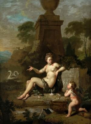 Venus et Cupidon, huile sur panneau, , trace de signature, marque de collection à la cire et inscription en cyrillique au verso, 49x37 cm
