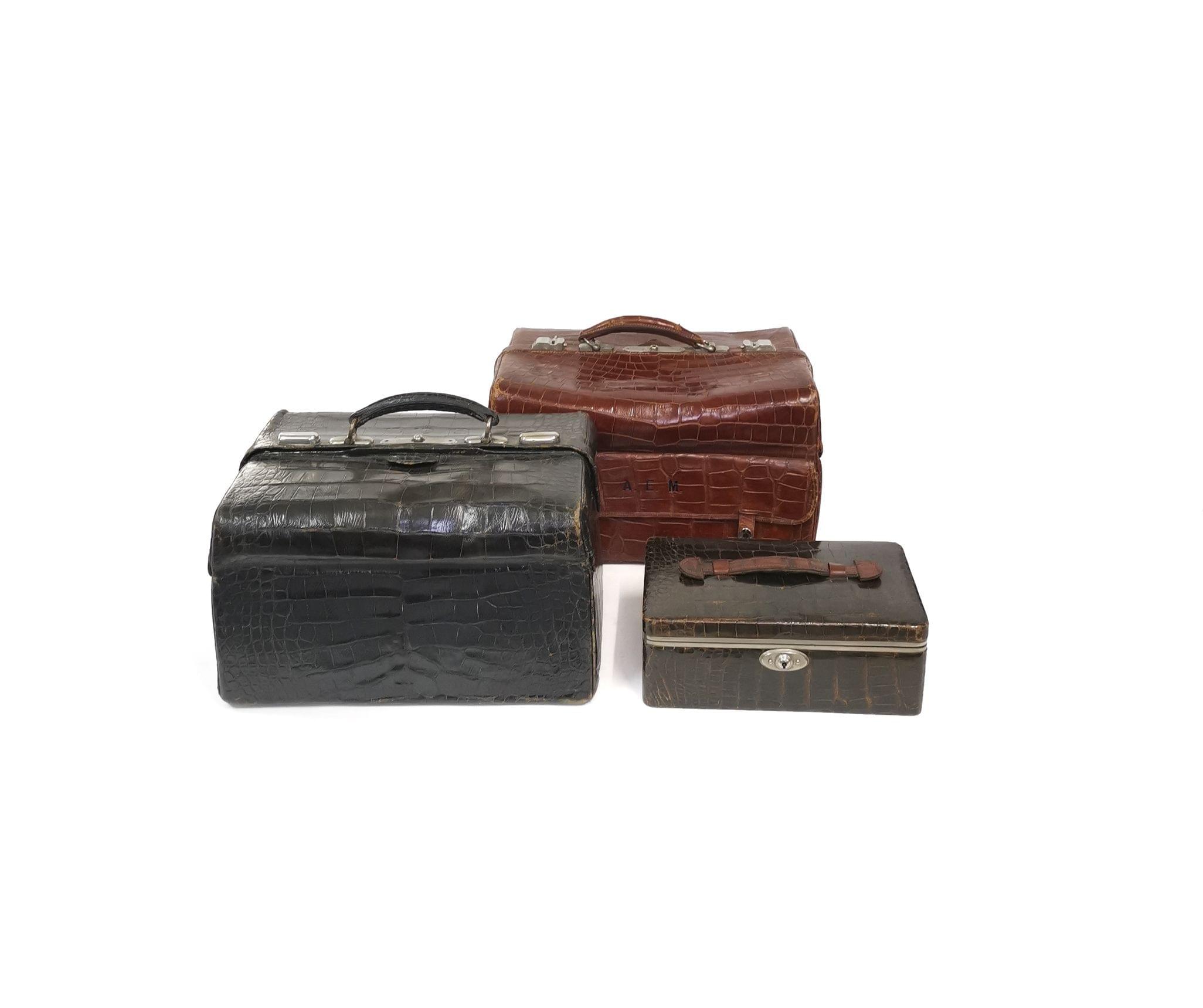 Croco noir et marron, intérieur en cuir camel et tissu bordeaux, garniture en métal, 23x40x30 cm, 19x30x11 cm et 31x40x26 cm. Provenance: collection baronne Marion Lambert