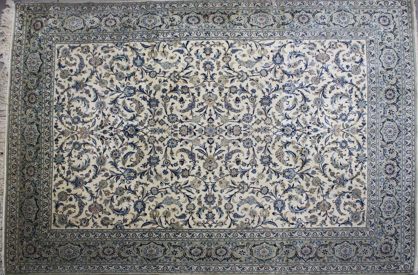 A décor de rinceaux sur fond ivoire, bordure sur fond bleu clair, laine, 380x280 cm