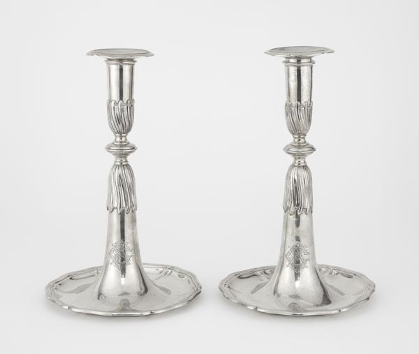 4172. Paire de chandeliers ménagère à crémaillère, l'un armorié